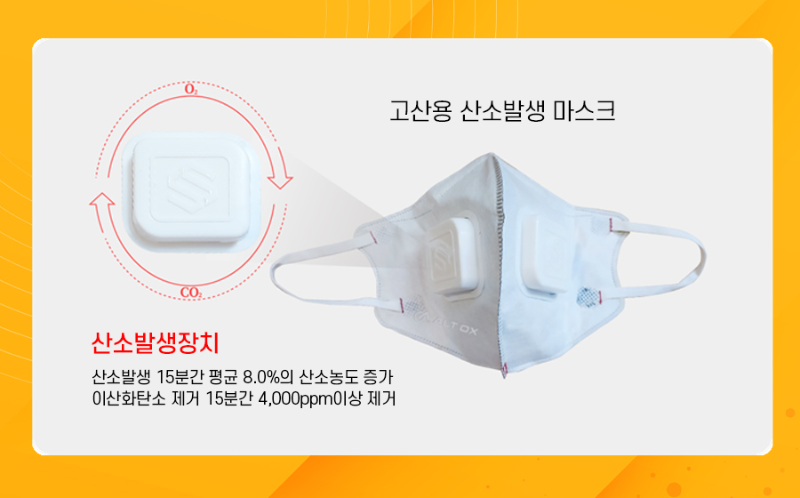 산소드림 생명구조 마스크는 산소발생장치를 국내 최초 탑재하여 안정성을 끌어올렸습니다. 산소발생장치는 개방과 동시에 산소공급부가 자동으로 작동되어 날숨에 포함된 이산화탄소 및 습기에 반응하여 산소를 발생시키고 이산화탄소는 제거해 주는 캡슐로 알트옥스의 혁신 기술입니다.